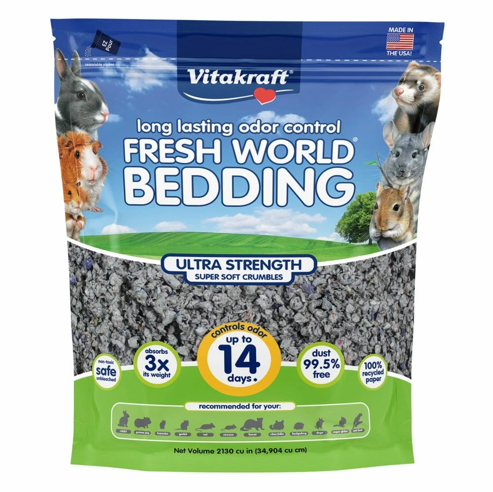 Virtually dust-free and capable of absorbing three times its weight in moisture, Vitakraft Fresh World® Bedding is the answer to your pet’s bedding problems. This soft and cozy bedding is made from 100% recycled paper, and offers up to 7 days of odor control for a happier, healthier home. It’s safe & bleach-free, soft for burrowing and nesting pets, and a great way to reduce your impact on the environment.
