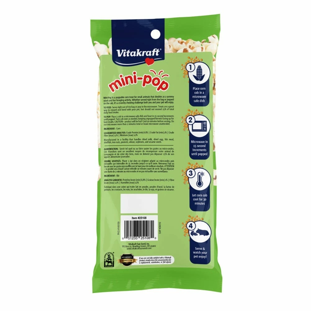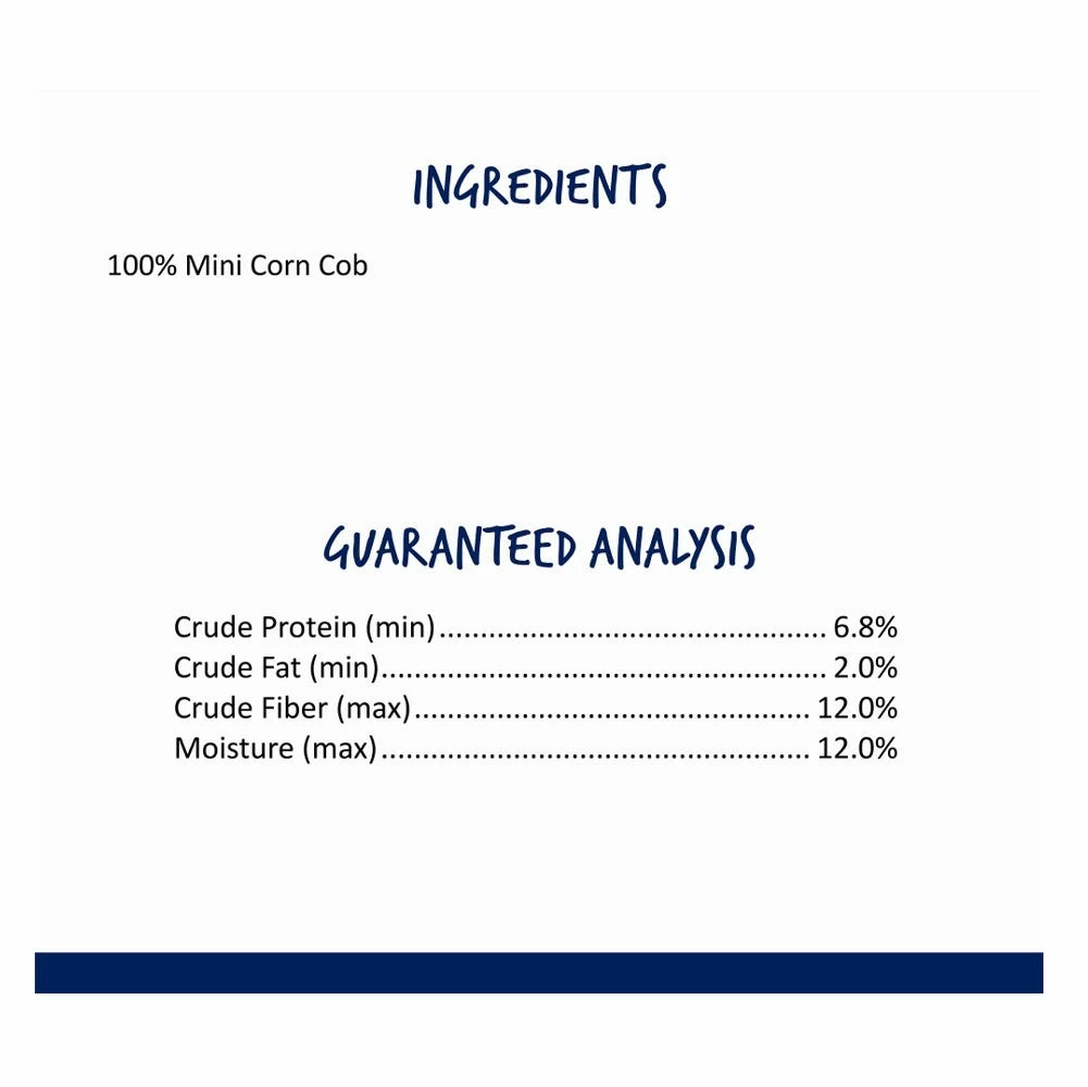 Mini-Pop is a favorite foraging treat for many small animal companions. Served unpopped, for a crunchy texture that helps wear and clean constantly growing teeth; or popped, for the kernels’ soft, natural nutrition that helps keep your pet healthy and full of energy. These colorful cobs can be fed to your pet as a satisfying treat just as they are or microwaved into a bouquet of aromatic popcorn. Either way, your pet gets lots of natural nutrients from the sweet, wholesome corn kernels. And underneath there’s a cob that’s fun to gnaw on for hours.