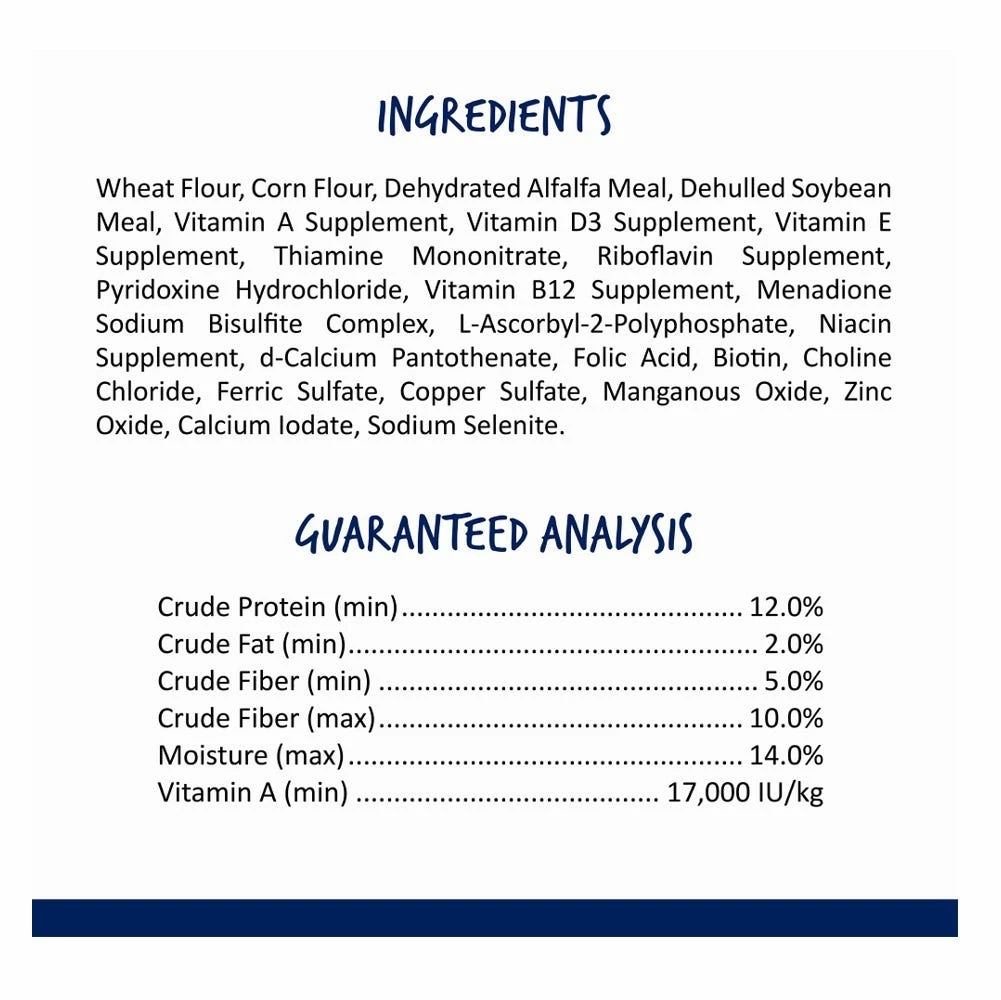 Wheat Flour, Corn Flour, Dehydrated Alfalfa Meal, Dehulled Soybean Meal, Vitamin A Supplement, Vitamin D3 Supplement, Vitamin E Supplement, Thiamine Mononitrate, Riboflavin Supplement, Pyridoxine Hydrochloride, Vitamin B12 Supplement, Menadione Sodium Bisulfite Complex, L-Ascorbyl-2-Polyphosphate, Niacin Supplement, d-Calcium Pantothenate, Folic Acid, Biotin, Choline Chloride, Ferric Sulfate, Copper Sulfate, Manganous Oxide, Zinc Oxide, Calcium Iodate, Sodium Selenite.