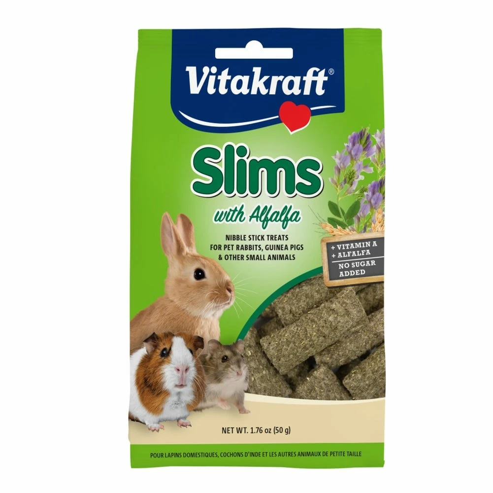 Made with tasty field-grown alfalfa hay and harvest fresh grains, Slims with Alfalfa Hay are an excellent nibbling treat for small animals that can be offered daily. The crunchy, oven baked texture provides a fun outlet for natural chewing instincts and helps promote healthy teeth.