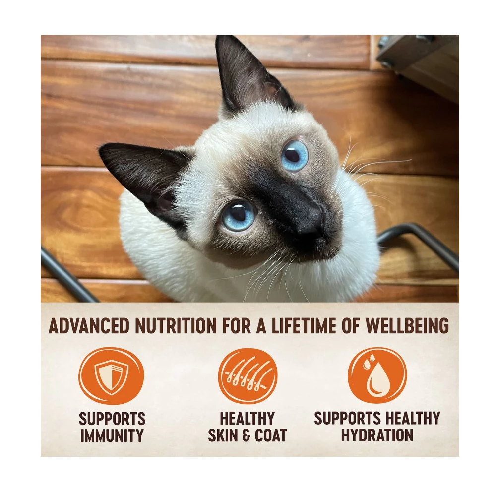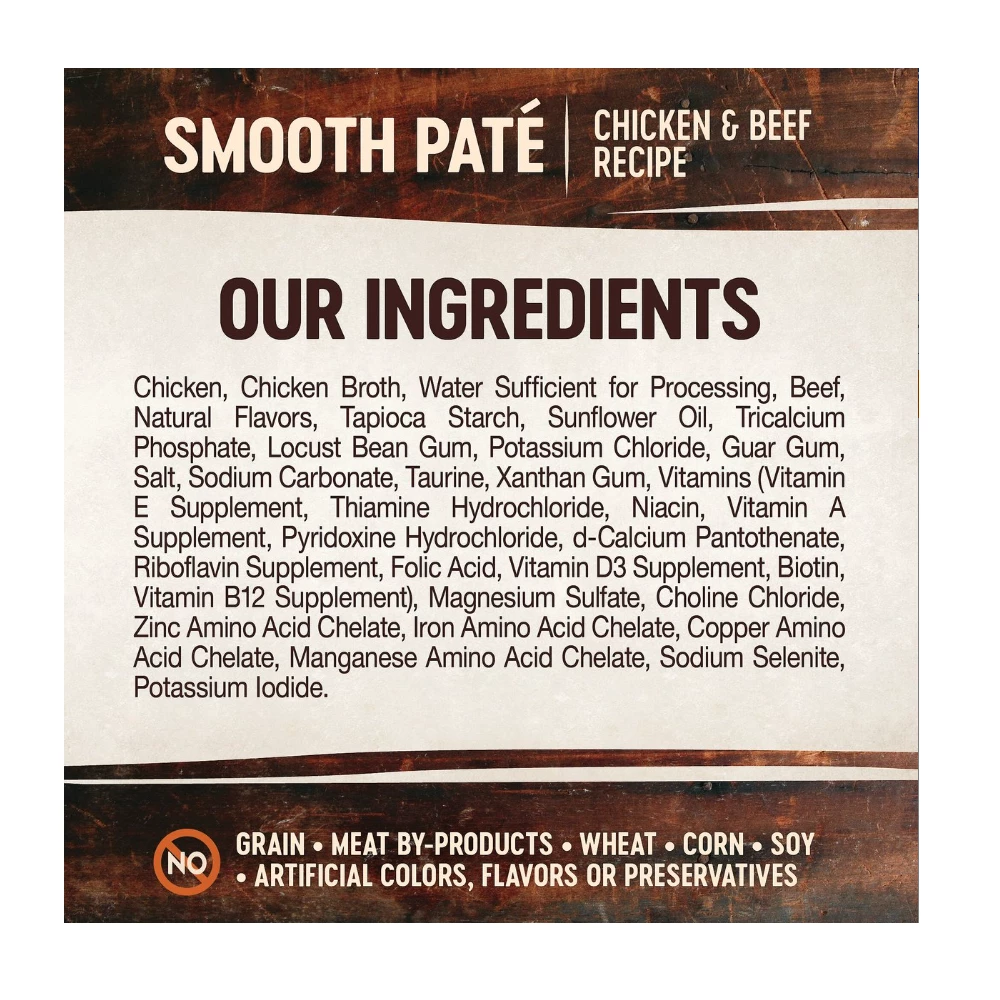 Ingredients: Chicken, Chicken Broth, Water Sufficient for Processing, Beef, Natural Flavors, Tapioca Starch, Sunflower Oil, Tricalcium Phosphate, Locust Bean Gum, Potassium Chloride, Guar Gum, Salt, Sodium Carbonate, Taurine, Xanthan Gum, Vitamins (Vitamin E Supplement, Thiamine Hydrochloride, Niacin, Vitamin A Supplement, Pyridoxine Hydrochloride, d-Calcium Pantothenate, Riboflavin Supplement, Folic Acid, Vitamin D3 Supplement, Biotin, Vitamin B12 Supplement), Magnesium Sulfate, Choline Chloride, Zinc Amino Acid Chelate, Iron Amino Acid Chelate, Copper Amino Acid Chelate, Manganese Amino Acid Chelate, Sodium Selenite, Potassium Iodide.