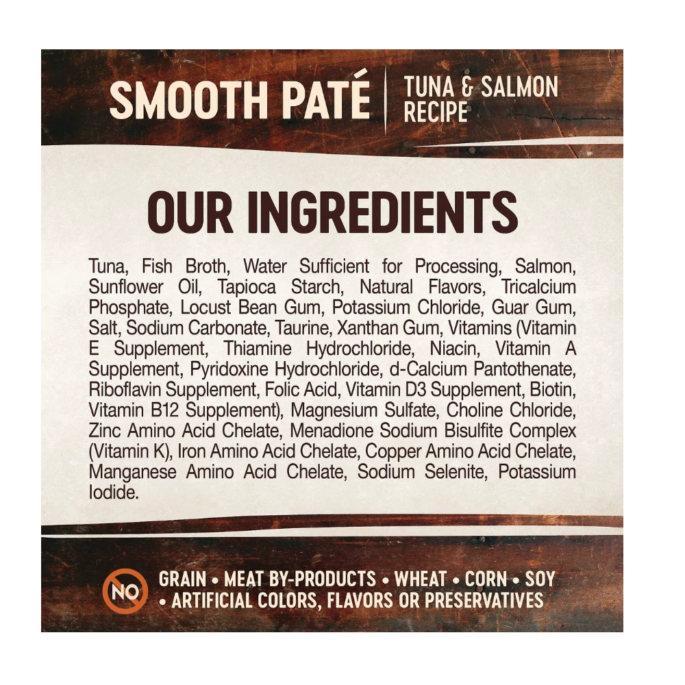 Ingredients: Tuna, Fish Broth, Water Sufficient For Processing, Salmon, Sunflower Oil, Tapioca Starch, Natural Flavors, Tricalcium Phosphate, Locust Bean Gum, Potassium Chloride, Guar Gum, Salt, Sodium Carbonate, Taurine, Xanthan Gum, Vitamins (Vitamin E Supplement, Thiamine Hydrochloride, Niacin, Vitamin A Supplement, Pyridoxine Hydrochloride, D-Calcium Pantothenate, Riboflavin Supplement, Folic Acid, Vitamin D3 Supplement, Biotin, Vitamin B12 Supplement), Magnesium Sulfate, Choline Chloride, Zinc Amino Acid Chelate, Menadione Sodium Bisulfite Complex (Vitamin K), Iron Amino Acid Chelate, Copper Amino Acid Chelate, Manganese Amino Acid Chelate, Sodium Selenite, Potassium Iodide. To feed alone: 4 – 5 pouches/day for each 6-8 lbs of body weight. To feed with dry: reduce dry by ⅛ cup for every 1 pouch wet.
