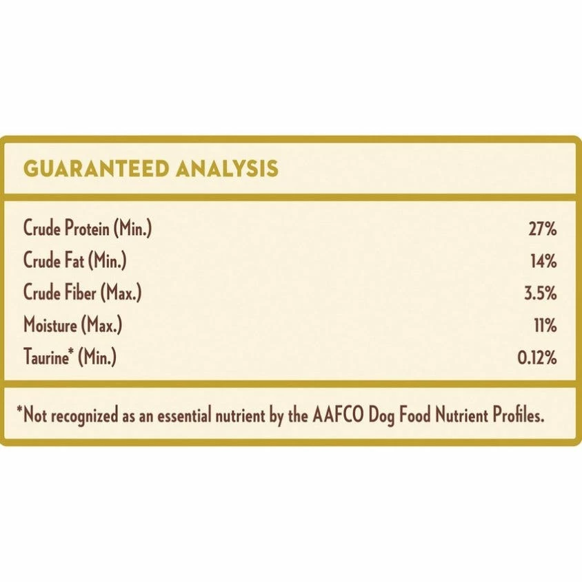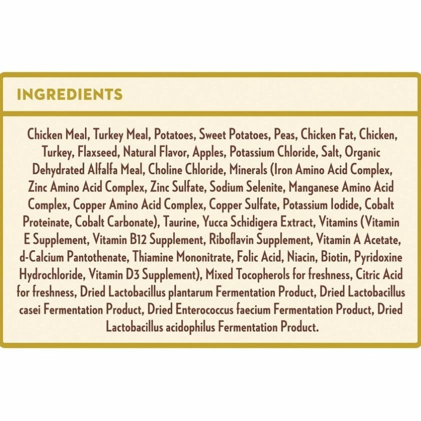 Chicken Meal, Potatoes, Canola Meal, Peas, Chicken Fat, Sweet Potato, Chicken, Turkey, Natural Flavor, Flaxseed, Apples, Carrots, Dried Beet Pulp, Dried Yeast, Potassium Chloride, Salt, Vitamins (Vitamin E Supplement, Vitamin B12 Supplement, Vitamin A Acetate, D-Calcium Pantothenate, Thiamine Mononitrate, Folic Acid, Riboflavin Supplement, Niacin, Pyridoxine Hydrochloride, Biotin, Vitamin D3 Supplement), Choline Chloride, Minerals (Iron Amino Acid Complex, Zinc Amino Acid Complex, Zinc Sulfate, Sodium Selenite, Manganese Amino Acid Complex, Copper Amino Acid Complex, Copper Sulfate, Potassium Iodide), Taurine, Mixed Tocopherols For Freshness, Citric Acid For Freshness, Dried Lactobacillus Plantarum Fermentation Product, Dried Lactobacillus Casei Fermentation Product, Dried Enterococcus Faecium Fermentation Product, Dried Lactobacillus Acidophilus Fermentation Product. 2C85520