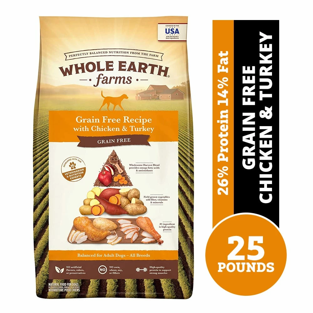 Feed your canine companion balanced nutrition with real ingredients straight from the farm! Whole Earth Farms Grain-Free Chicken & Turkey Recipe Dry Dog Food is developed by veterinarians and nutrition experts and cooked in the USA with nature’s best ingredients. Real, high-quality protein is the very first ingredient and is followed by field grown veggies for a fiber-filled, balanced natural dog food that’s packed with vitamins and minerals. This grain-free meal is packed with protein from chicken and turkey to help support your paw-tner’s strong muscles, contains a Wholesome Harvest Blend that delivers omega fatty acids for skin and coat health and contains antioxidants for a healthy immune system. And you can have peace of mind knowing that this natural dog food is 100% free from corn, wheat, soy, artificial flavors, colors, preservatives, fillers and animal by-product meals.