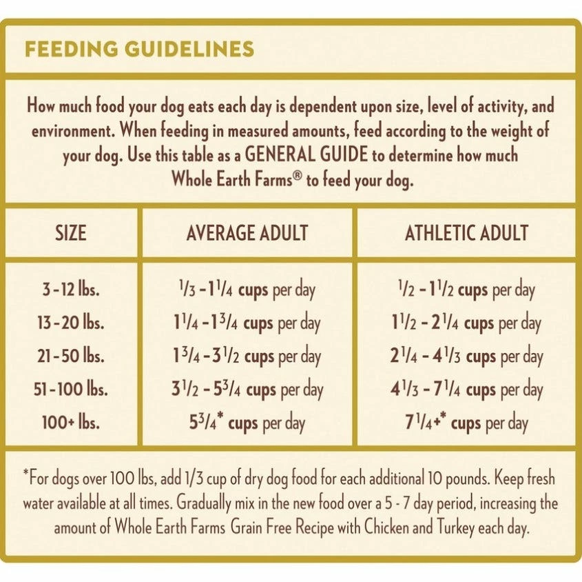 Gradually mix in the new food over a 5 – 7 day period, increasing the amount of Whole Earth Farms Grain Free Recipe with Chicken and Turkey each day.