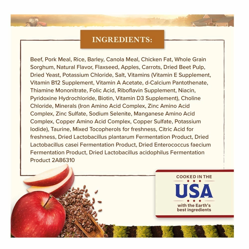 Beef, Pork Meal, Rice, Barley, Canola Meal, Chicken Fat, Whole Grain Sorghum, Natural Flavor, Flaxseed, Apples, Carrots, Dried Beet Pulp, Dried Yeast, Potassium Chloride, Salt, Vitamins (Vitamin E Supplement, Vitamin B12 Supplement, Vitamin A Acetate, d-Calcium Pantothenate, Thiamine Mononitrate, Folic Acid, Riboflavin Supplement, Niacin, Pyridoxine Hydrochloride, Biotin, Vitamin D3 Supplement), Choline Chloride, Minerals (Iron Amino Acid Complex, Zinc Amino Acid Complex, Zinc Sulfate, Sodium Selenite, Manganese Amino Acid Complex, Copper Amino Acid Complex, Copper Sulfate, Potassium Iodide), Taurine, Mixed Tocopherols for freshness, Citric Acid for freshness, Dried Lactobacillus plantarum Fermentation Product, Dried Lactobacillus casei Fermentation Product, Dried Enterococcus faecium Fermentation Product, Dried Lactobacillus acidophilus Fermentation Product. 2A86310