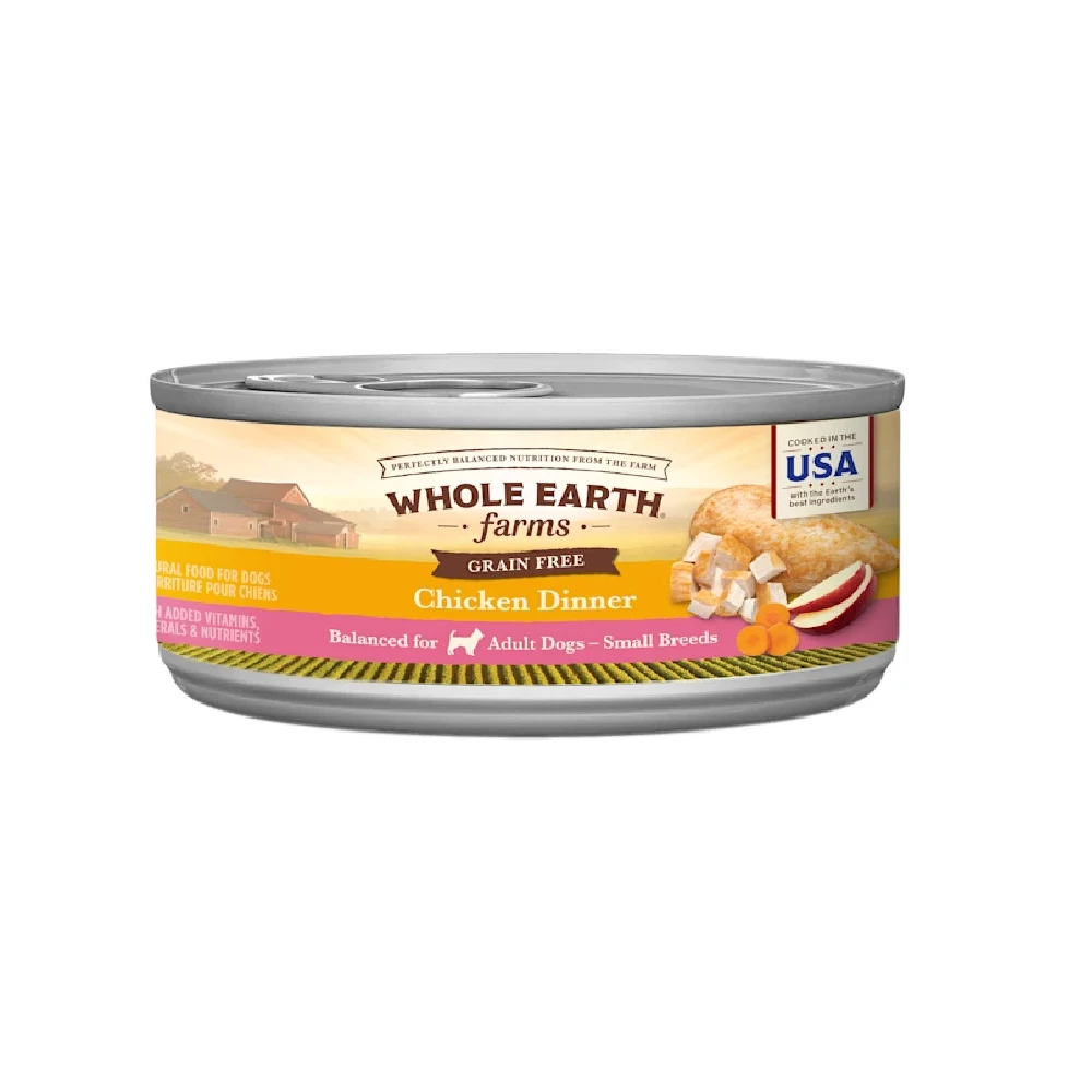 Feed your little furry friend Whole Earth Farms Small Breed Chicken Dinner Grain-Free Canned Dog Food—a recipe that’s cooked in the USA with the Earth’s best ingredients. This grain-free recipe delivers balanced nutrition with real USA-raised chicken as the very first ingredient to support your buddy’s strong muscles. It also contains Whole Earth Farms’ Wholesome Harvest Blend of field grown sweet potatoes, carrots and apples from a trusted network of farmers to give your small breed sidekick a dog food that’s packed with natural fiber, nutrients, vitamins and minerals. Developed with veterinarian and nutrition experts, this recipe is completely free from corn, soy and wheat ingredients and is also made without fillers, animal by-product meals or artificial flavors, colors or preservatives. This ground pate can be fed as a standalone meal or as a tasty topper for your dog’s favorite kibble. It is also a paw-fect option for senior dogs because it’s easy for their sensitive teeth to chew.