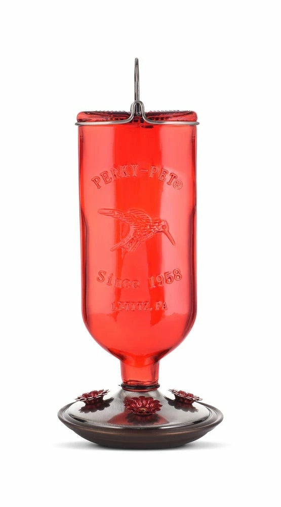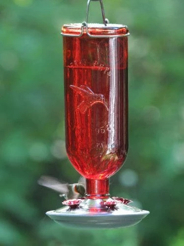 - Decorative, red antique-style glass bottle hummingbird feeder