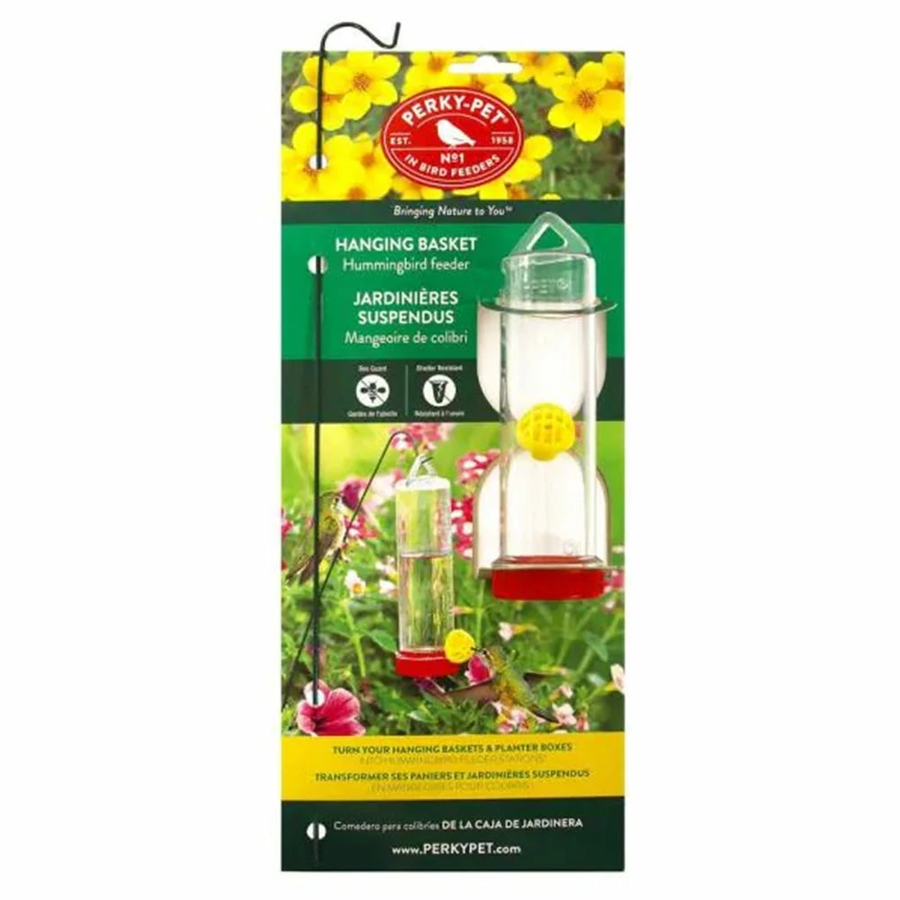 This hanging bird feeder for hummingbirds is just perfect for hanging over a planter box, creating an attractive environment sure to please the tiny gentle creatures. The Perky-Pet planter box hummingbird feeder with hanging rod features a bee guard, one feeding port and a 3 oz. nectar capacity. It comes with a hanging rod which allows for placement over a planter box. For best results, use Perky-Pet instant nectar. This specially blended nectar is easy to use, and requires no boiling. The feeder may be cleaned with the Perky-Pet cleaning mop. Remember to clean your hanging bird feeder at least twice a week, more often in very warm climates or seasons.