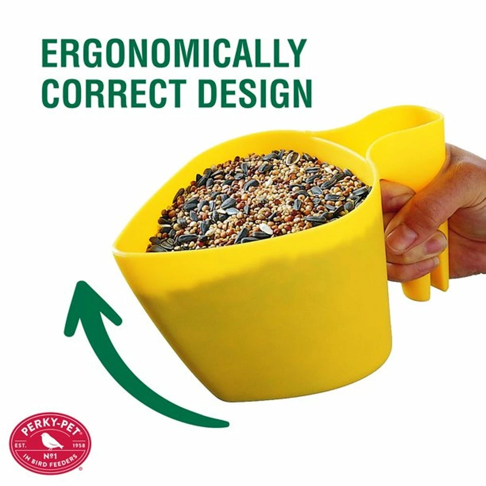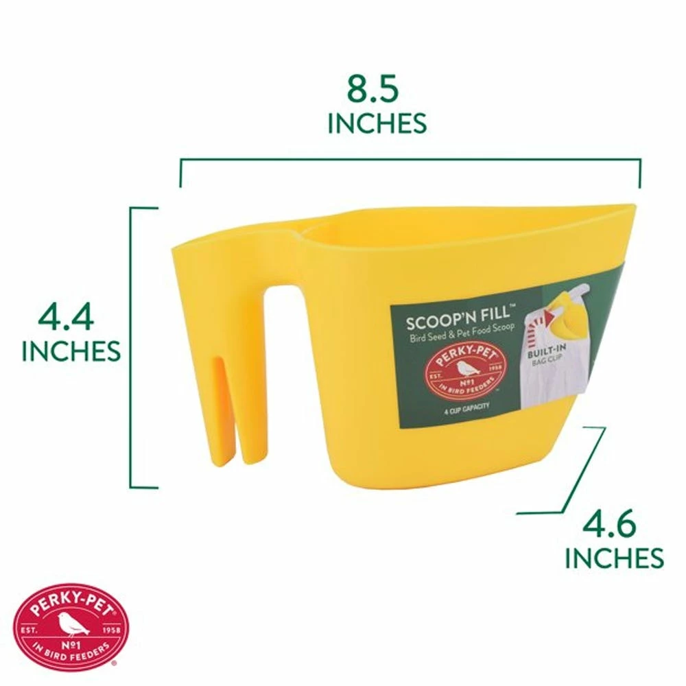 Refilling your bird feeders has never been easier with this ergonomically designed bright yellow seed scoop. The Perky-Pet Yellow Scoop N’ Fill Wild Bird Seed Scoop features a built-in bag clip (hooks on to seed bag to keep seed fresher, longer). Constructed of durable plastic, this bird seed and pet food scoop holds a generous 4 cups of seed or food. The handle of the scoop attaches directly to the seed bag, sealing in freshness. Keeping your feeders full and ready for visitors has never been easier!