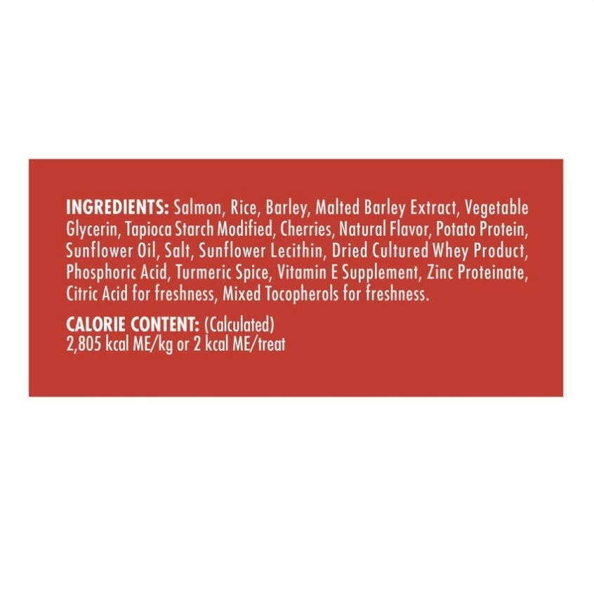 Salmon, Rice, Barley, Malted Barley Extract, Vegetable Glycerin, Tapioca Starch Modified, Cherries, Natural Flavor, Potato Protein, Sunflower Oil, Salt, Sunflower Lecithin, Dried Cultured Whey Product, Phosphoric Acid, Turmeric Spice, Vitamin E Supplement, Zinc Proteinate, Citric Acid For Freshness, Mixed Tocopherols For Freshness.